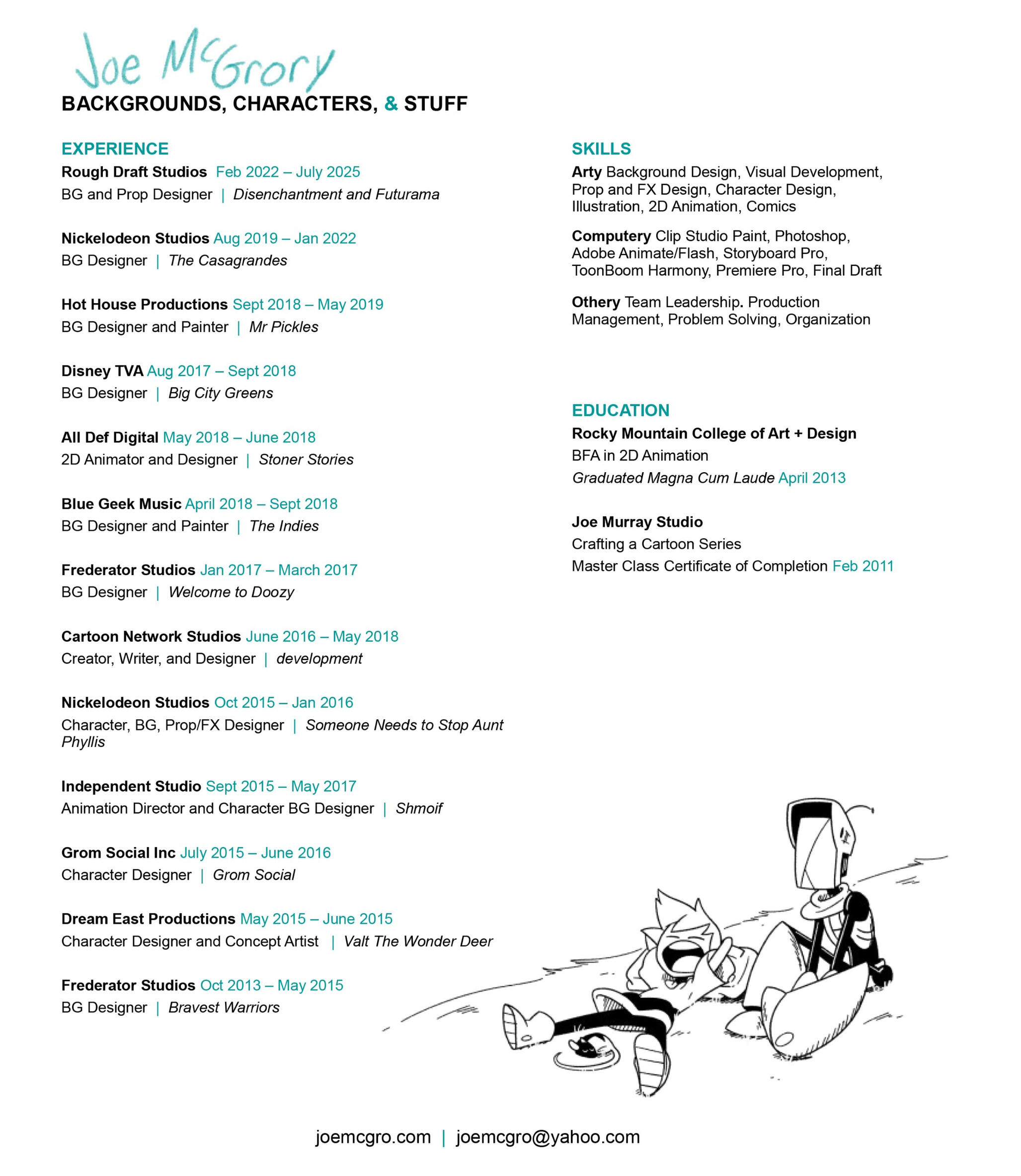 Joe McGrory makes backgrounds and characters and stuff, most often for animation. He loves pairing stylized characters with detailed, lived-in environments. In the studio, Joe enjoys being involved from the ground up in projects, managing complex problems and scenarios and breaking them down into workable, simple solutions. Outside of the studio, Joe is often hard at work developing his own projects and eating cereal.He prefers peanut butter cereal when available.